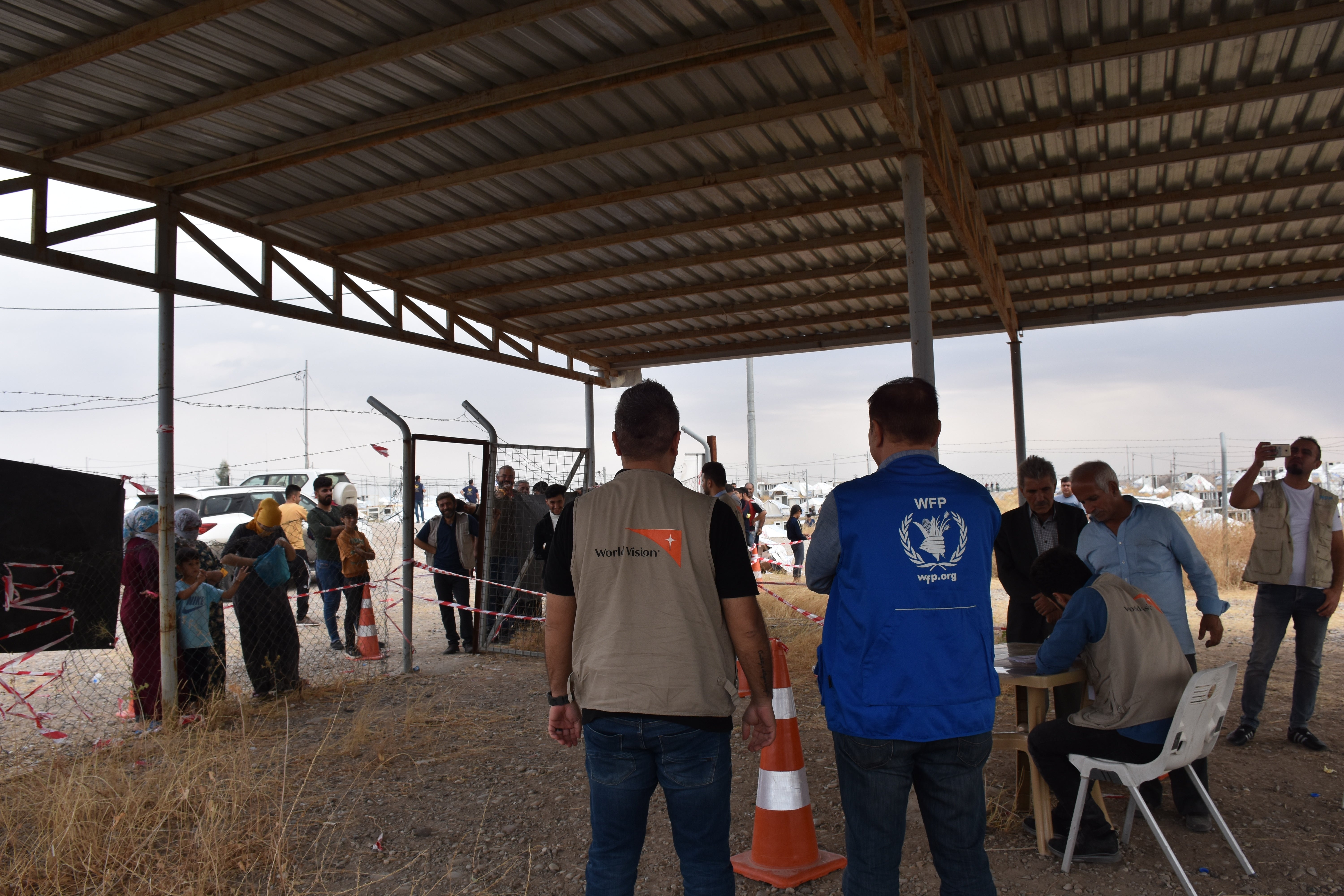 World Vision junto con el PMA, preparando y entregando alimentos a 500 familias que llegan al campamento de Baradarsh, en Irak. Las familias huyen de la escalada de violencia en el noreste de Siria, dejando todo atrás y llegando apenas con lo básico.