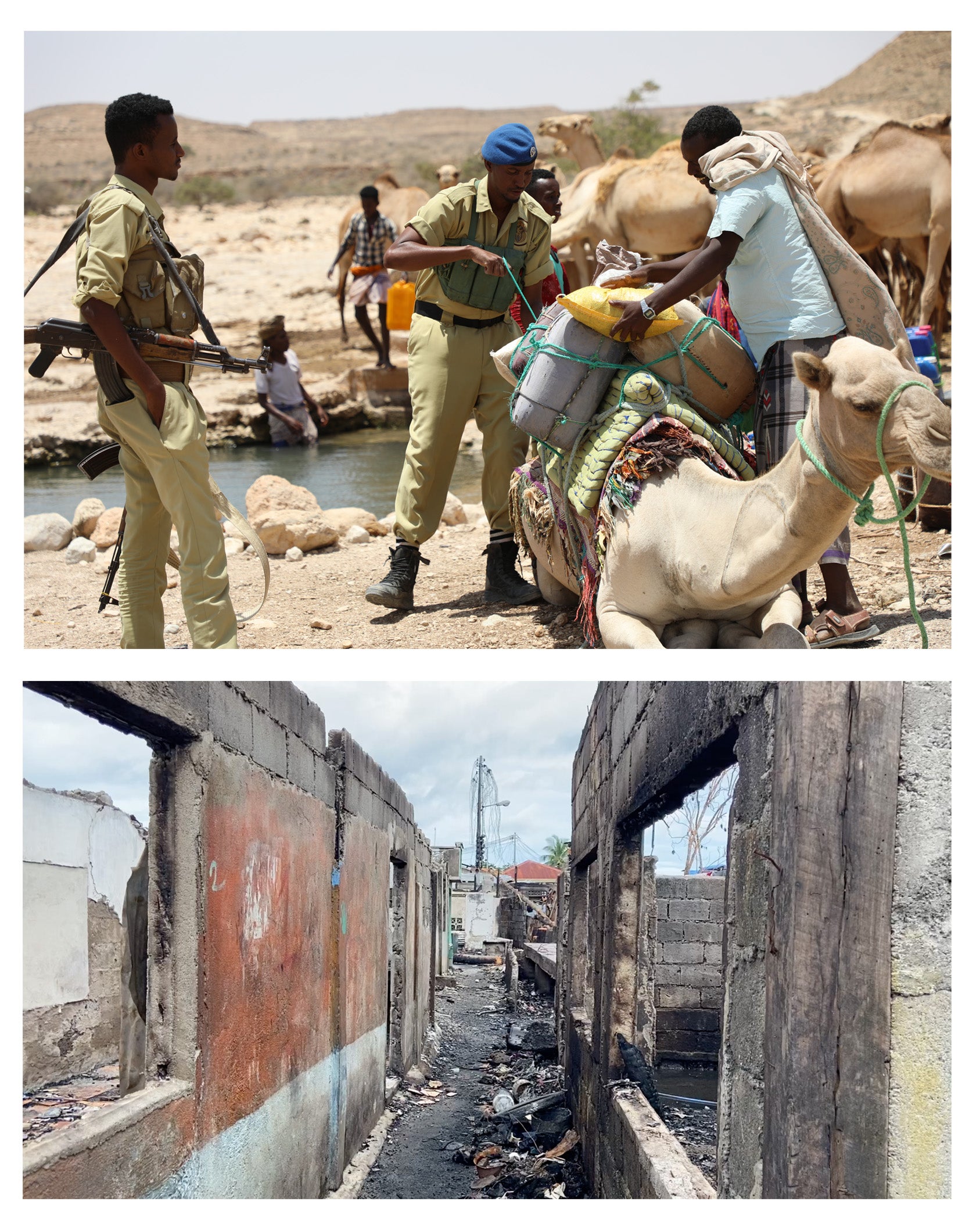 En Somalia (imagen superior), los dispositivos de seguridad, las armas, los vehículos blindados y las semanas de planificación de la seguridad, el trazado de rutas alternativas y la implicación de la comunidad local son parte normal del trabajo. En muchos de nuestros lugares, cuando se produce una catástrofe estamos en el lugar en cuestión de horas colaborando con los grupos locales para evaluar y adaptarnos. La imagen inferior muestra la destrucción causada recientemente por los incendios en Mindanao (Filipinas).
