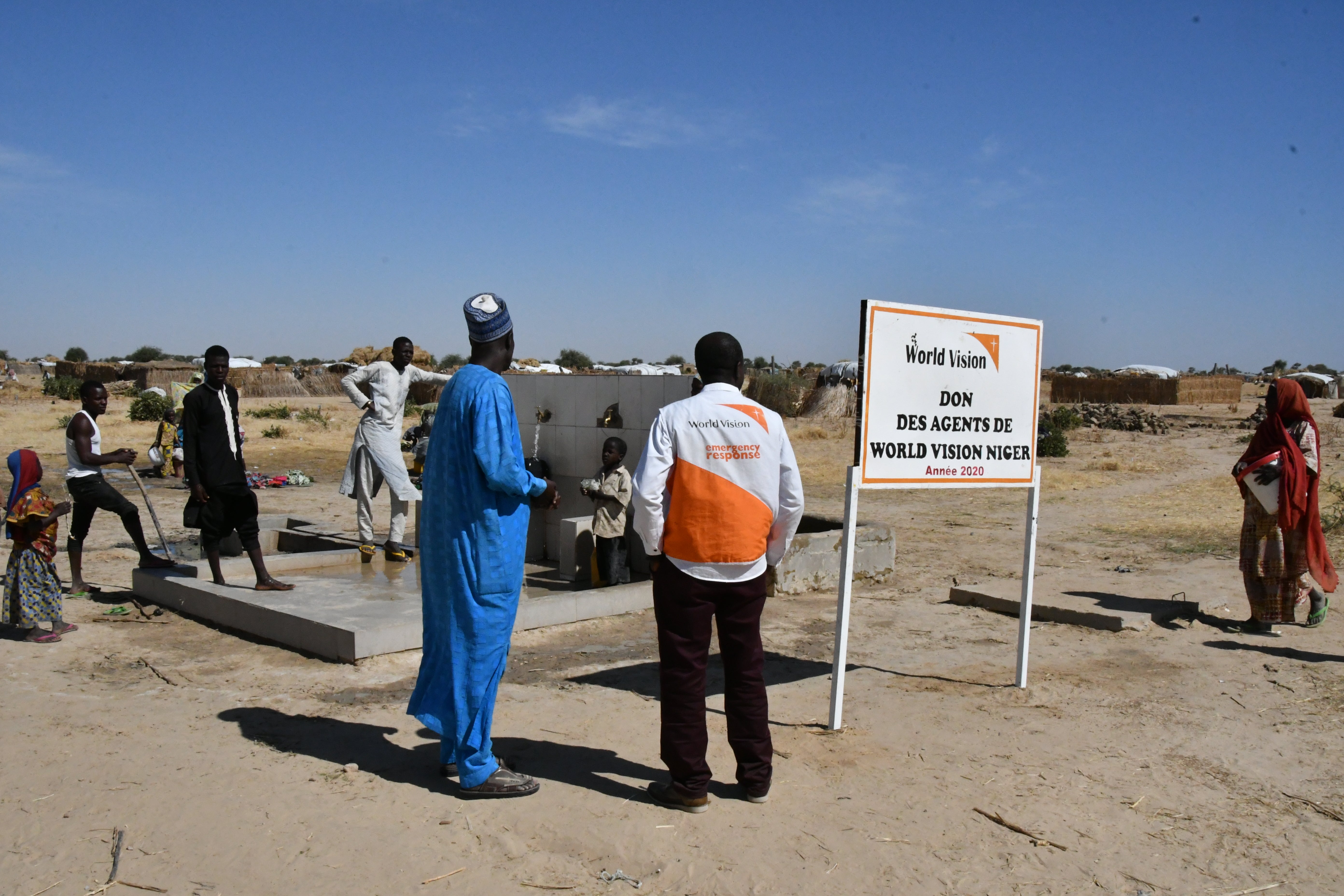 Boulama, jefe de la aldea de Gueskerou, con el coordinador del programa frente a una de las estaciones de agua gracias a la energía solar. A principios de octubre de 2019, el río Komadougou en la región de Diffa (Níger) se desbordó de nuevo. 23.000 personas tuvieron que huir en pequeñas embarcaciones dejando sus aldeas, casas, tierras de cultivo y la vida que habían conocido y construido durante generaciones.